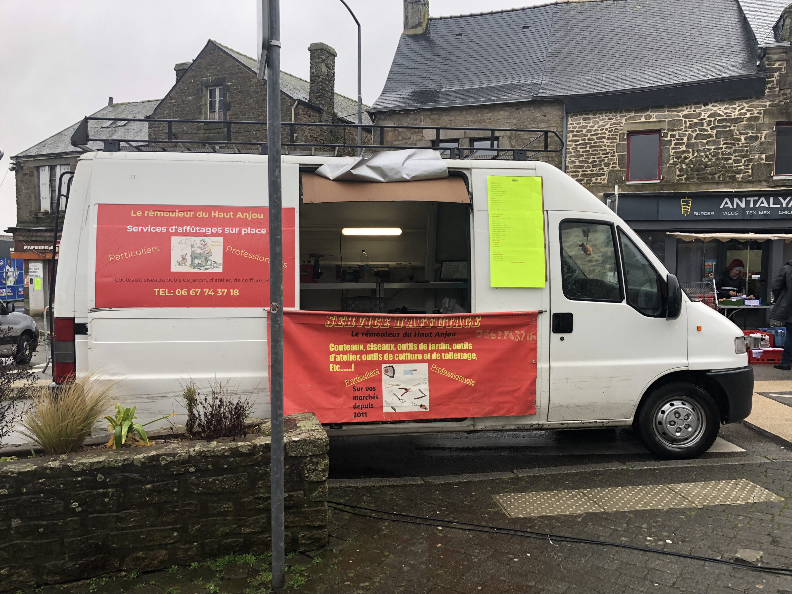 Doté d’une caravane aménagée en « atelier mobile d’affûtage », je vous propose de faire affûter vos objets pendant que vous faites vos achats sur le marché.Vous déposez vos objets en arrivant sur votre marché, et vous les récupérez lorsque vous avez terminé vos achats. De principe, tout les affûtages sont fait « sur place », hormis les scies circulaires qui demandent une attention particulières, les scies à bûches de 550 / 600, ou des quantités de peignes et contre peignes, ou de forêts importante. Qui dans ce cas sont remis la semaine suivante.